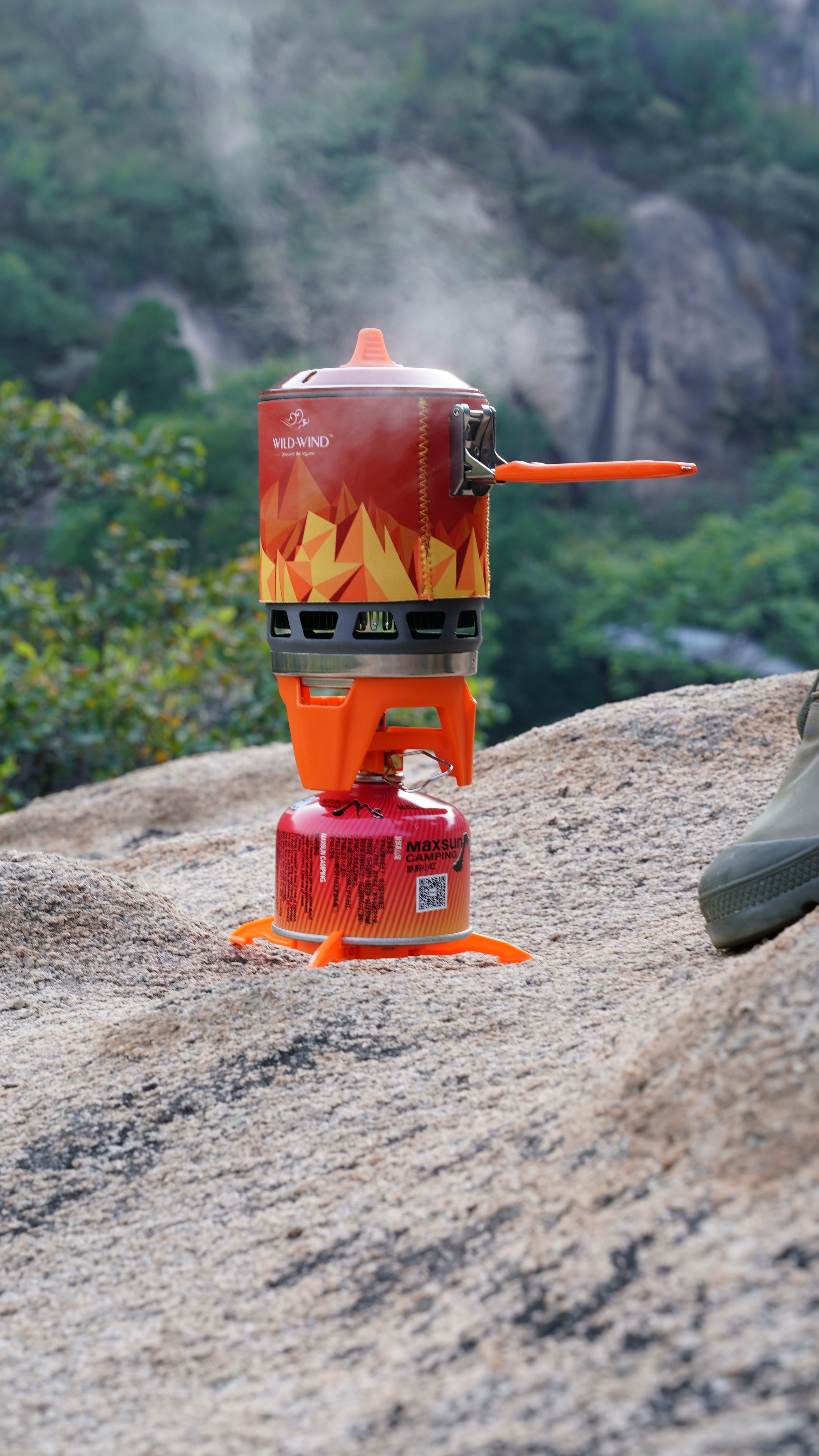 [Compact design for backpacking ]WILD-WIND X3 cooking system can pack stove base; pan support; fuel stabilizer and even 110g canister (sold separately) inside its 0.8 liter POT. The handle and Lid have lock design for carry without loose. POT is made of sturdy and light hard anodized aluminum for years of outdoor adventure.
