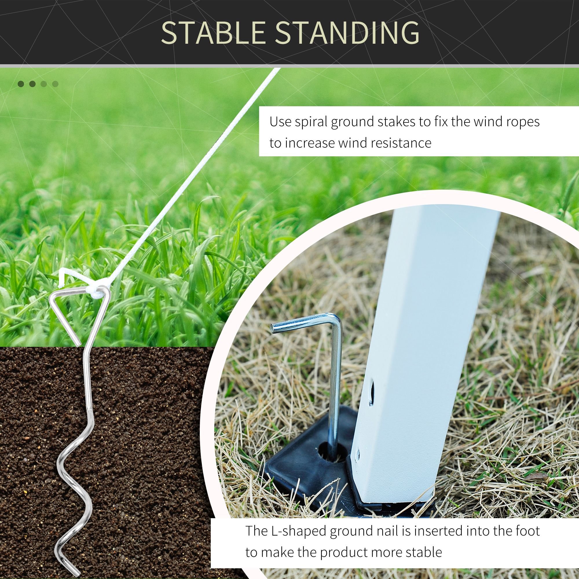 4.- QUALITY MATERIALS: The steel frame of this portable gazebo has adjustable legs and a powder-coated finish. It includes four wind ropes, four L-shaped ground stakes and four spiral ground stakes for extra stability. NOTE: Do not leave up in bad weather such as rain, snow, sleet, wind, or hail. Do not leave up overnight.
