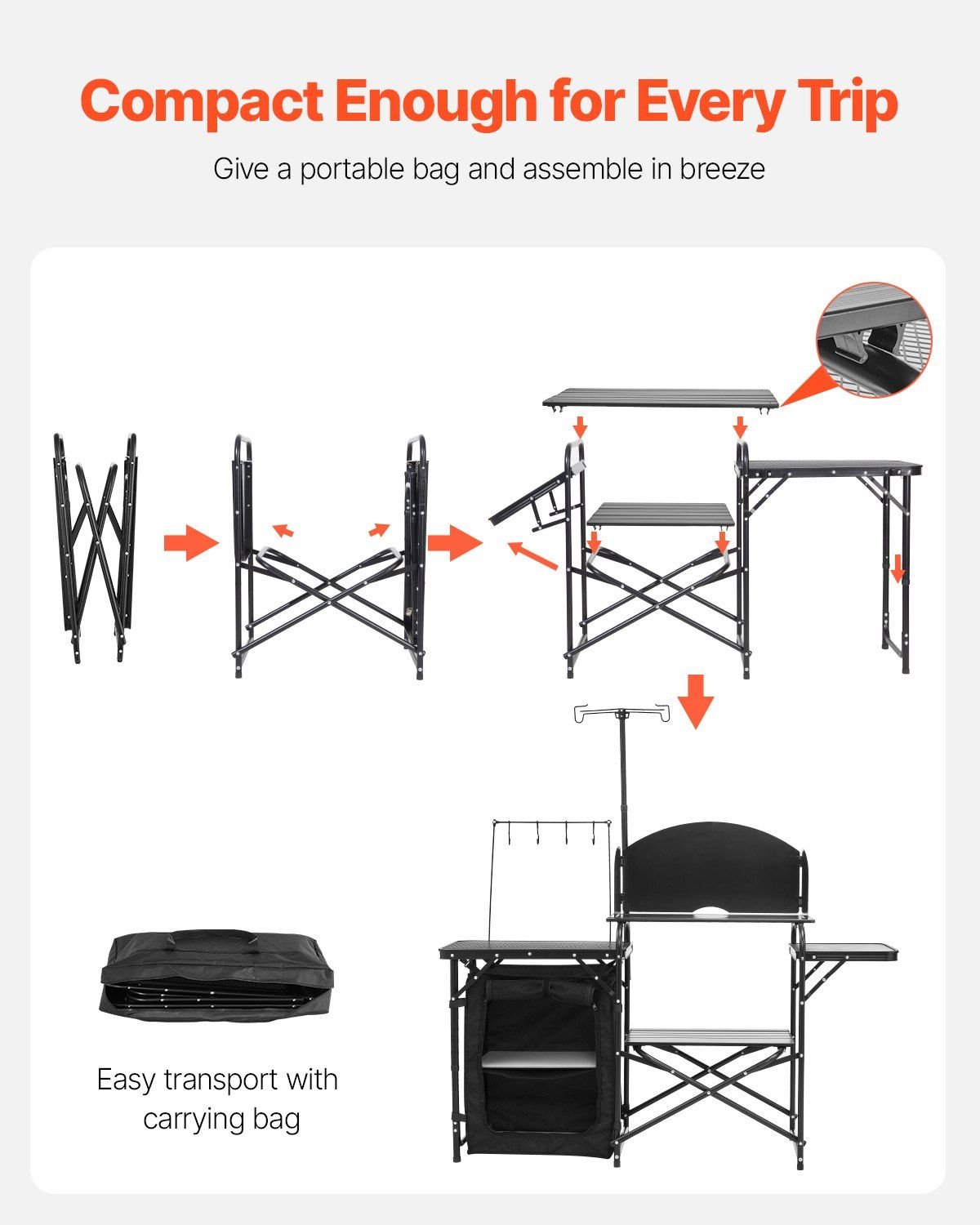 2.Marvel at its Quality: Our camping kitchen station is built to last thanks to its aluminum main table, steel grill & aluminum-plastic side tables. The camp kitchen is designed with a reinforced X-shaped structure, which provides better stability and security during operation