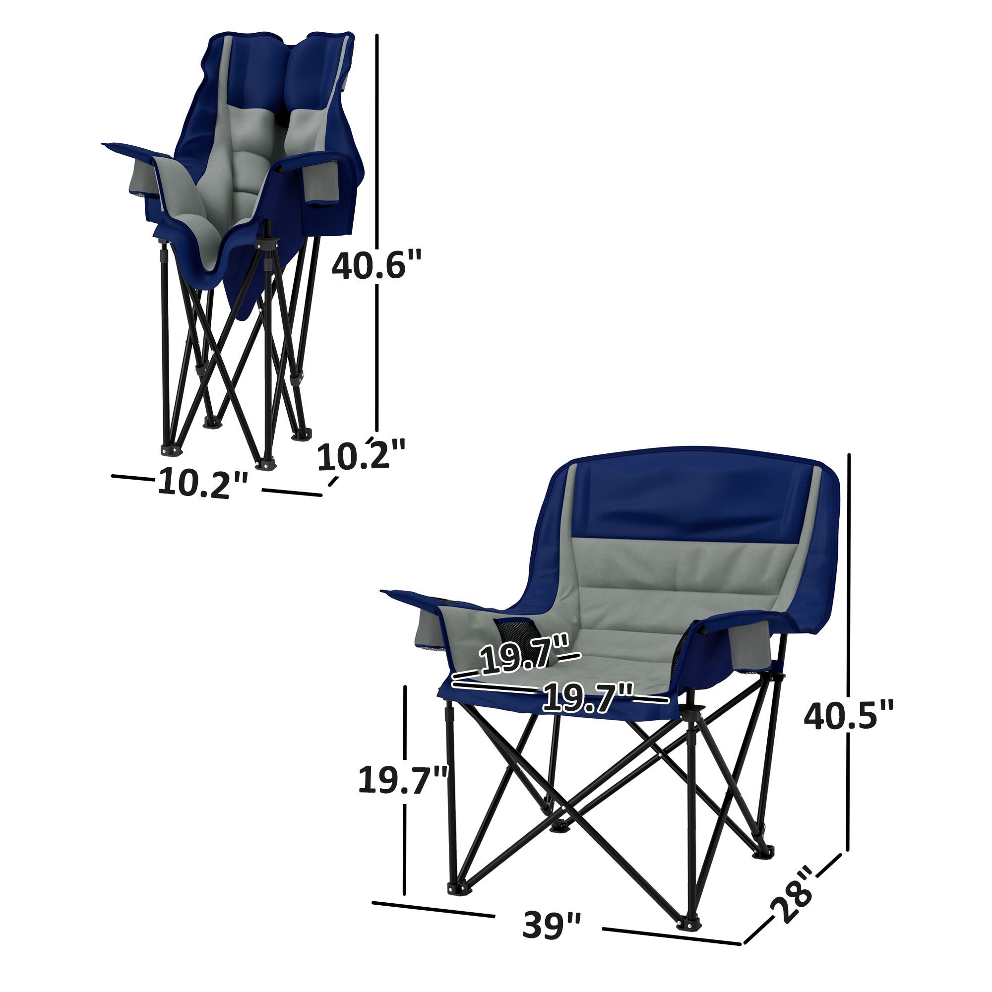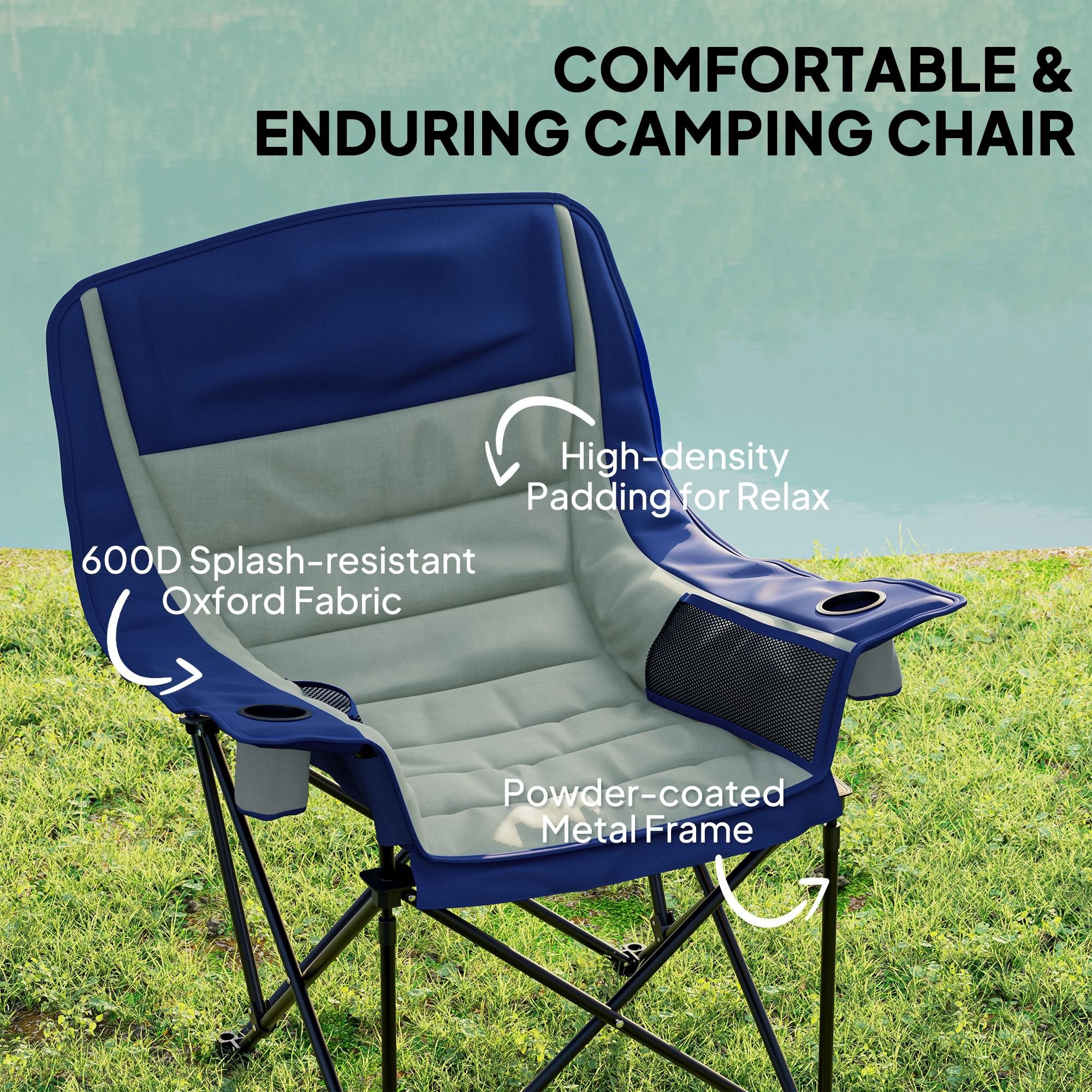 Discover the comfort of the Outsunny backpacking chair, featuring high-density padding in the headrest, backrest, armrests, and seat. Built with a robust metal frame and 600D Oxford fabric, this outdoor chair resists wear and weather. Dual cup holders and side pockets hold all of your camp snacks and drinks. Lightweight and easy to carry, it's suitable for any camping, fishing, or backyard lounging adventure as your go-to portable chair!