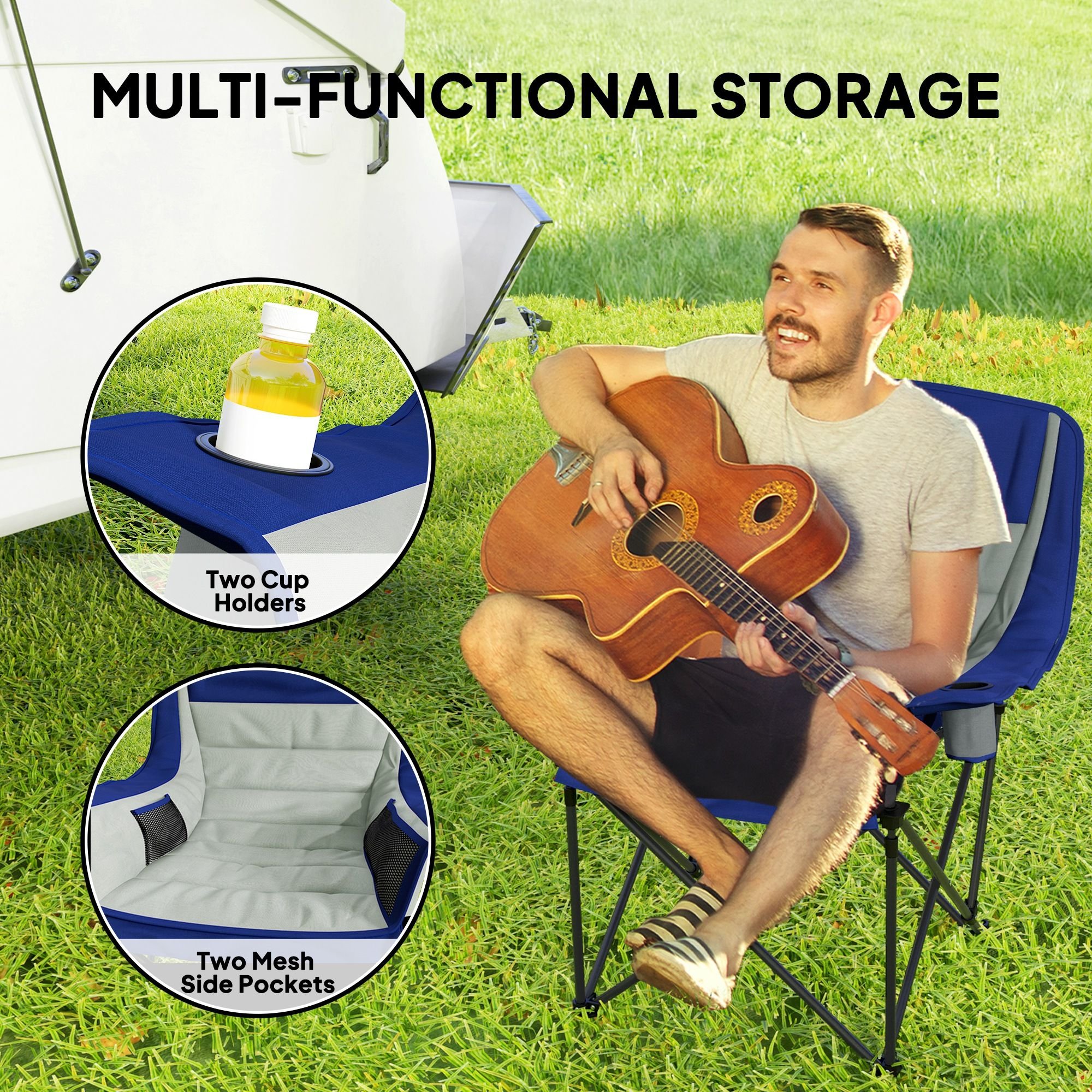 3.- Convenient Storage Options: Equipped with two cup holders and side pockets, this lawn chair allows you to easily store snacks, beverages, smartphones, and other camping essentials within arm's reach