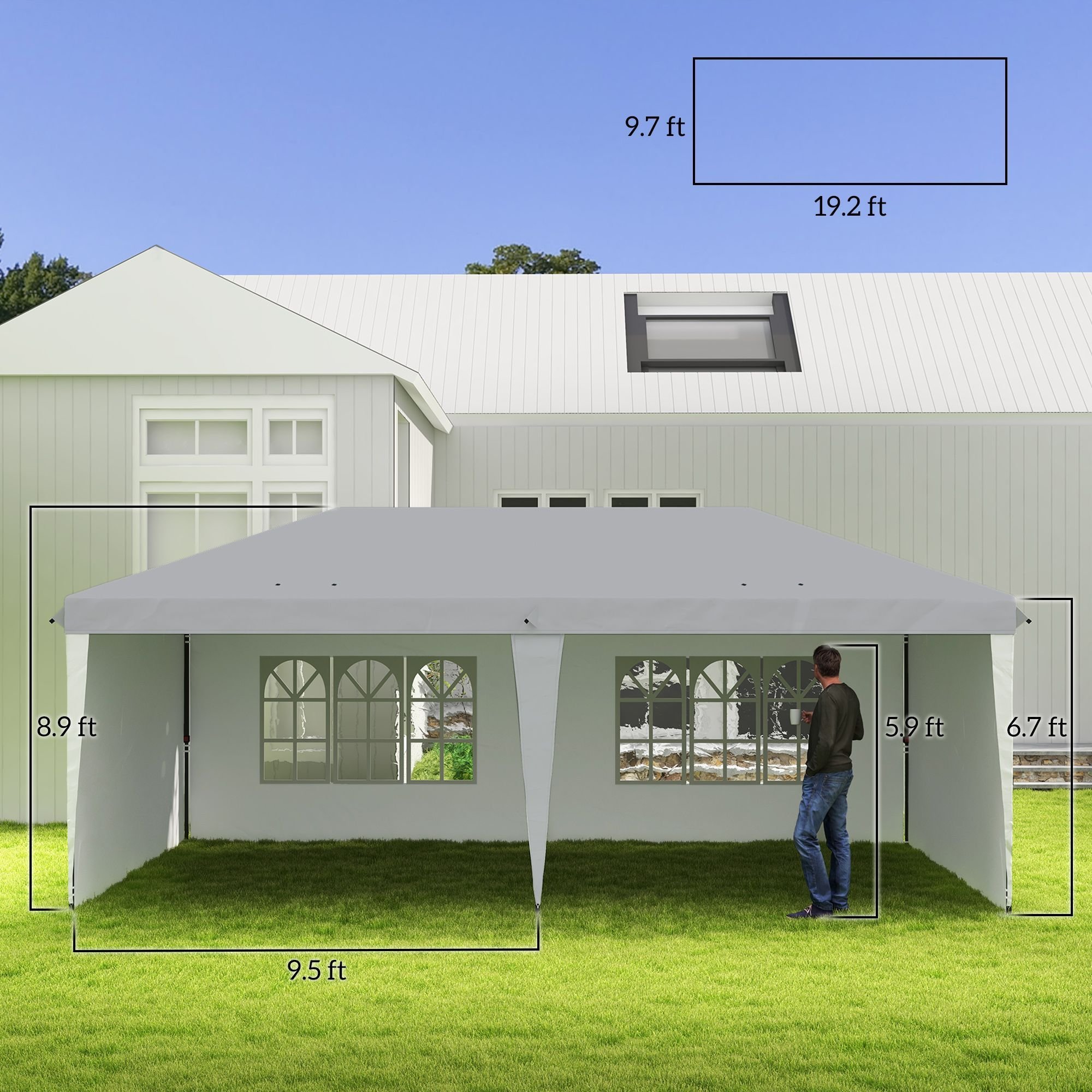 5.- Pop up Tent Info: Overall Dimensions: 19.2' L x 9.7' W x 8.9' H. Eaves Height: 6.7' H. Folded Dimensions: 13" L x 7.75" W x 45.25" H. Window Size: 72" L x 40.25" W. Due to its size, having 2-4 people will optimize assembly time and please and measure your site before purchase.