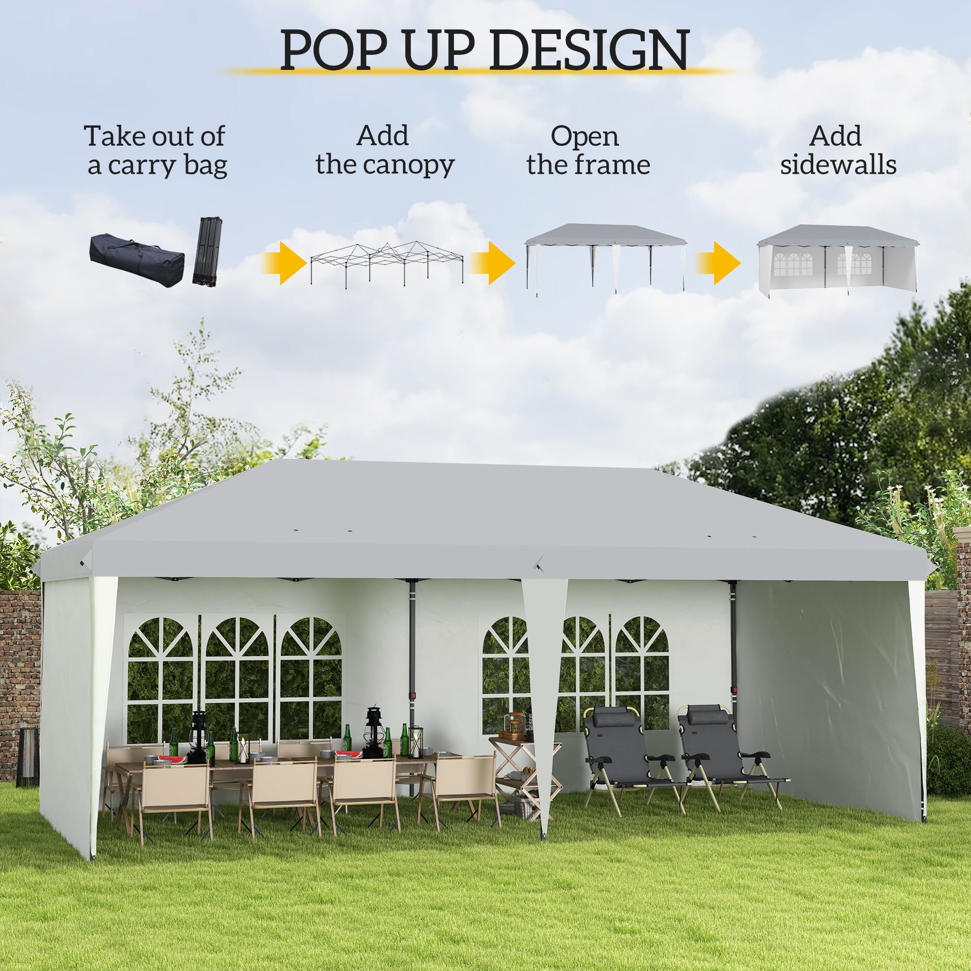 Pop in, pop up, and pop out. Outsunny's large easy up canopy offers superior shade with silver-coated Oxford fabric to block 90% of UV rays. Sidewalls stop wind and create a more secluded area. Windows allow adequate light, and stakes offer support on soft ground. Whether you want to use it for a wedding, barbeque, or outdoor event as a vendors tent, its convenient carrying bag makes travel and storage easy. Get out, get, comfy, get Outsunny.