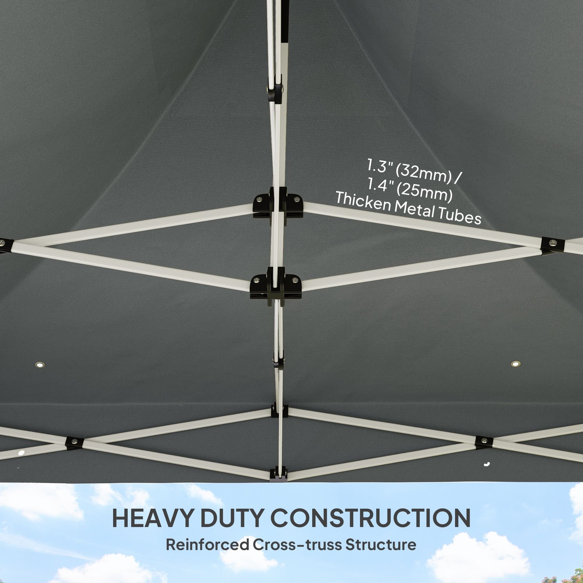 1.- Heavy-Duty Construction: Built to last, this outdoor canopy features reinforced 32mm and 25mm metal support tubes and a robust cross-truss structure, ensuring stability and resilience even in windy conditions.