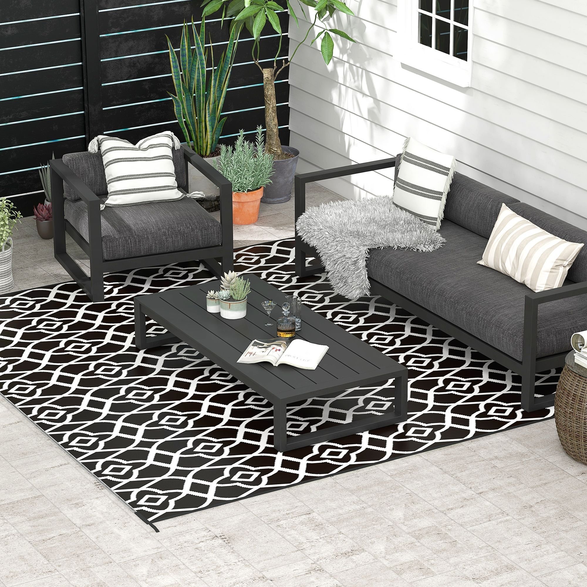 Camp on a carpet with Outsunny. This porch rug is designed to handle dirt. Outdoor-ready, our rug really cleans up fast; sweep, spray, wipe, or wave it; its powerful polypropylene fibers stay dry and don't saturate. Keep an outdoor rug in the camper, RV, or car; it's excellent for camping, beach trips, patio picnics, or anywhere outside. The color is reversible, meaning you can flip our plastic rug over for a fresh side or style. Upholster the outdoors with Outsunny.