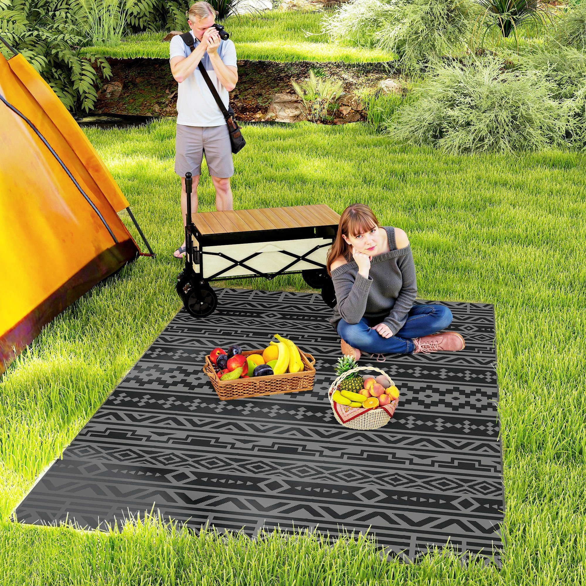 Camp on a carpet with Outsunny. This porch rug is designed to handle dirt. Outdoor-ready, our rug really cleans up fast; sweep, spray, wipe, or wave it; its powerful polypropylene fibers stay dry and don't saturate. Keep an outdoor rug in the camper, RV, or car; it's excellent for camping, beach trips, patio picnics, or anywhere outside. The color is reversible, meaning you can flip our plastic rug over for a fresh side or style. Upholster the outdoors with Outsunny.