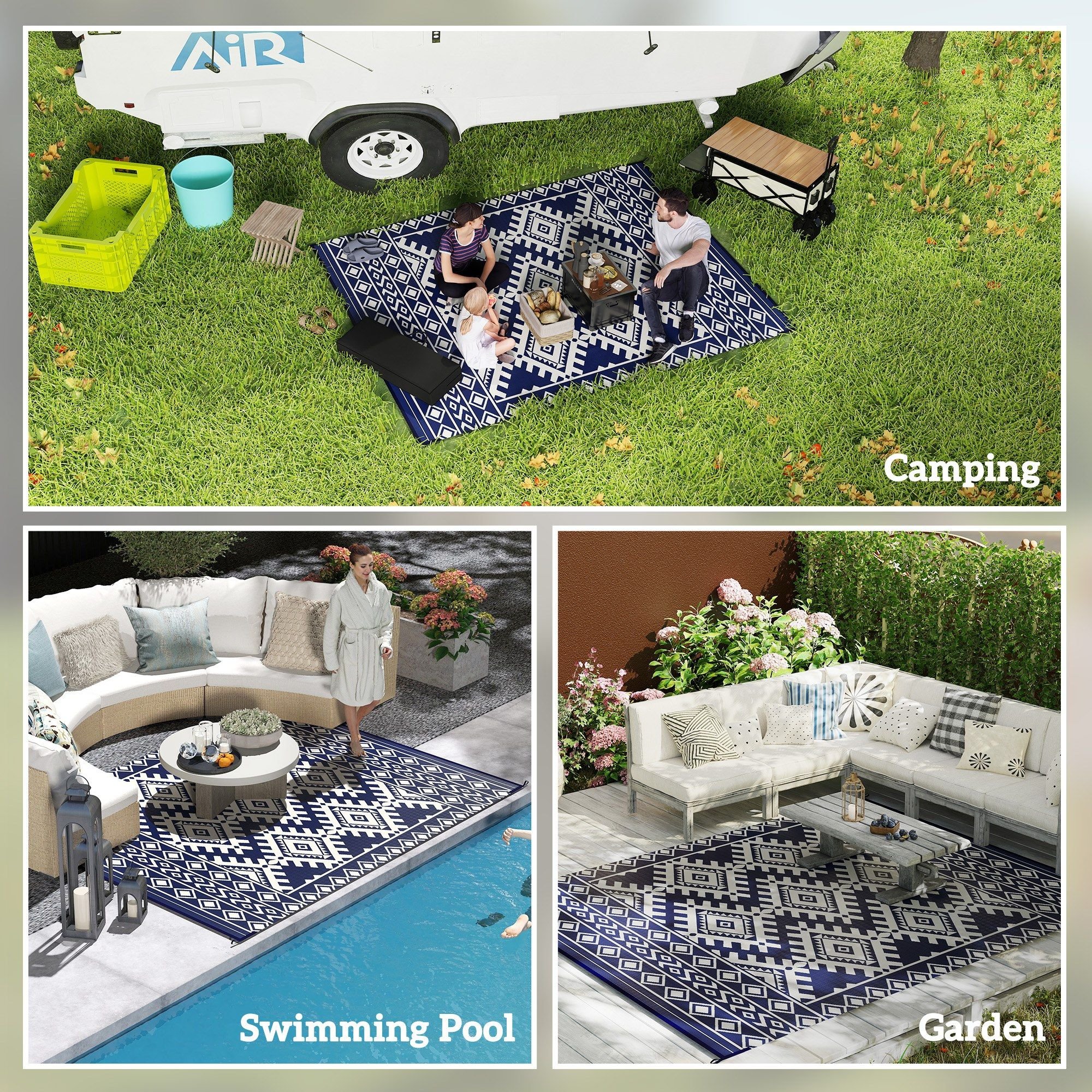 Camp on a carpet with Outsunny. This porch rug is designed to handle dirt. Outdoor-ready, our rug really cleans up fast; sweep, spray, wipe, or wave it; its powerful polypropylene fibers stay dry and don't saturate. Keep an outdoor rug in the camper, RV, or car; it's excellent for camping, beach trips, patio picnics, or anywhere outside. The color is reversible, meaning you can flip our plastic rug over for a fresh side or style. Upholster the outdoors with Outsunny.