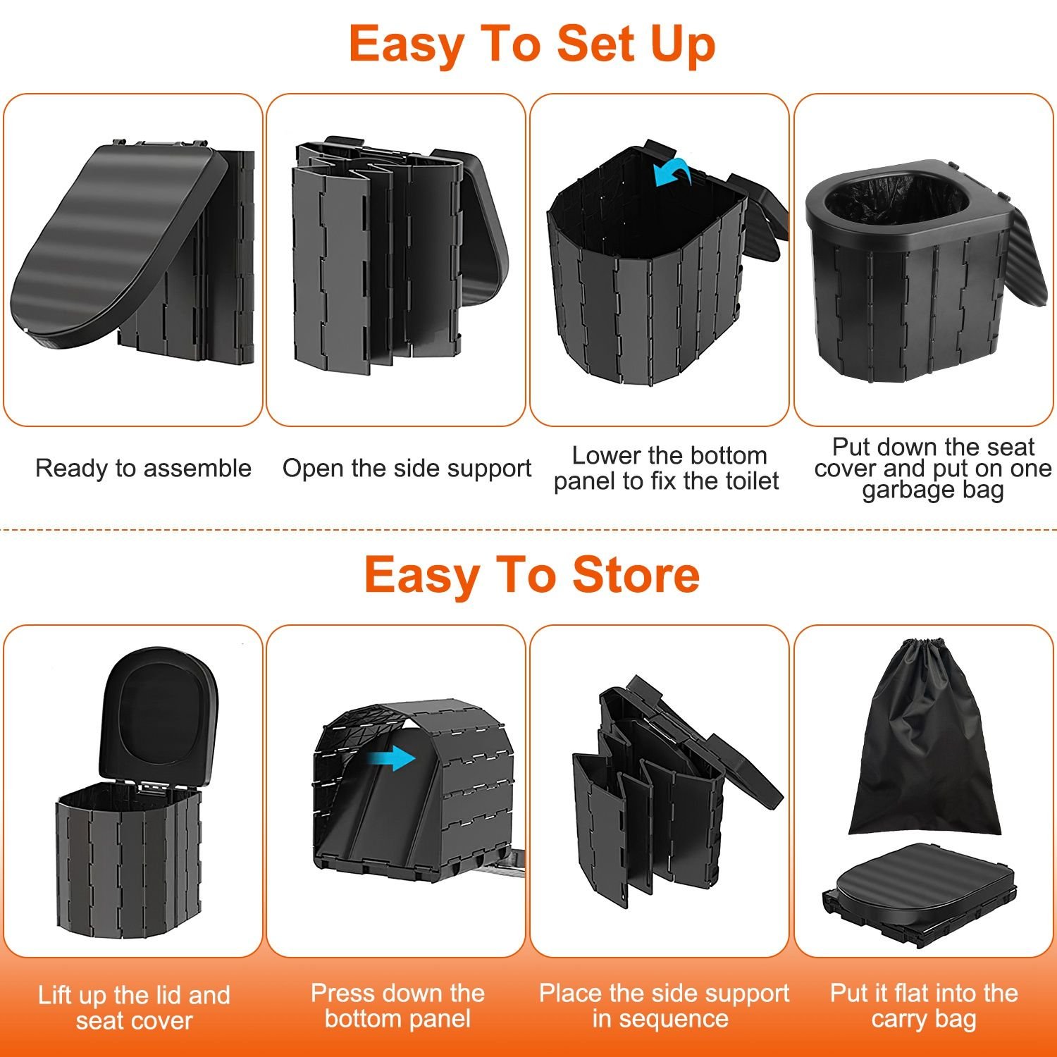 *Easy Assembly & Storage*:Just Open the side support,lower the bottom panel to fix the toilet,put down the seat cover and put on one of our included garbage bags. When finish,lift up the lid and seat cover,press down the bottom panel,place the side support in sequence and put it flat into the provided carry bag with a drawstring preventing falling off.